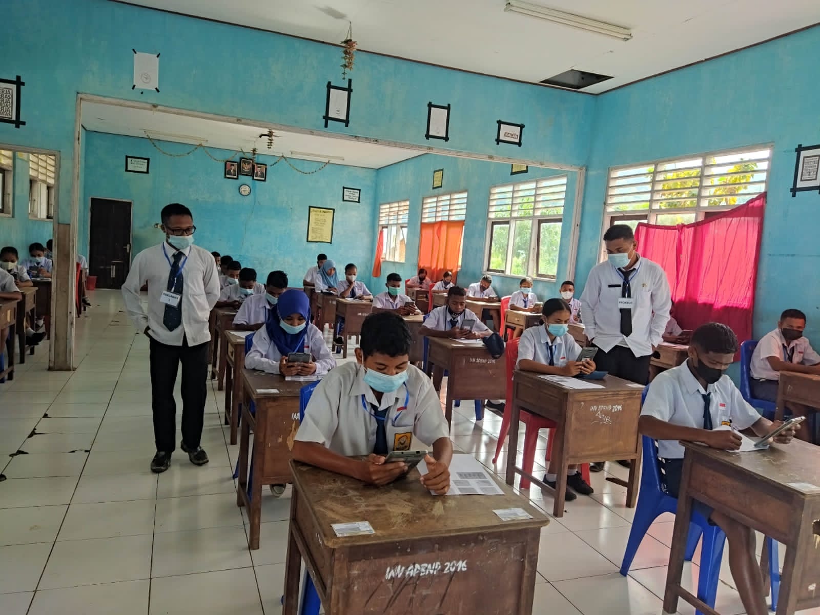Pelajar SMPN 4 Omesuri,Kabupaten Lembata sukses menyelenggarakan ujian sekolah hari pertama, Rabu 20 April 2022 dengan menggunakan handphone android.