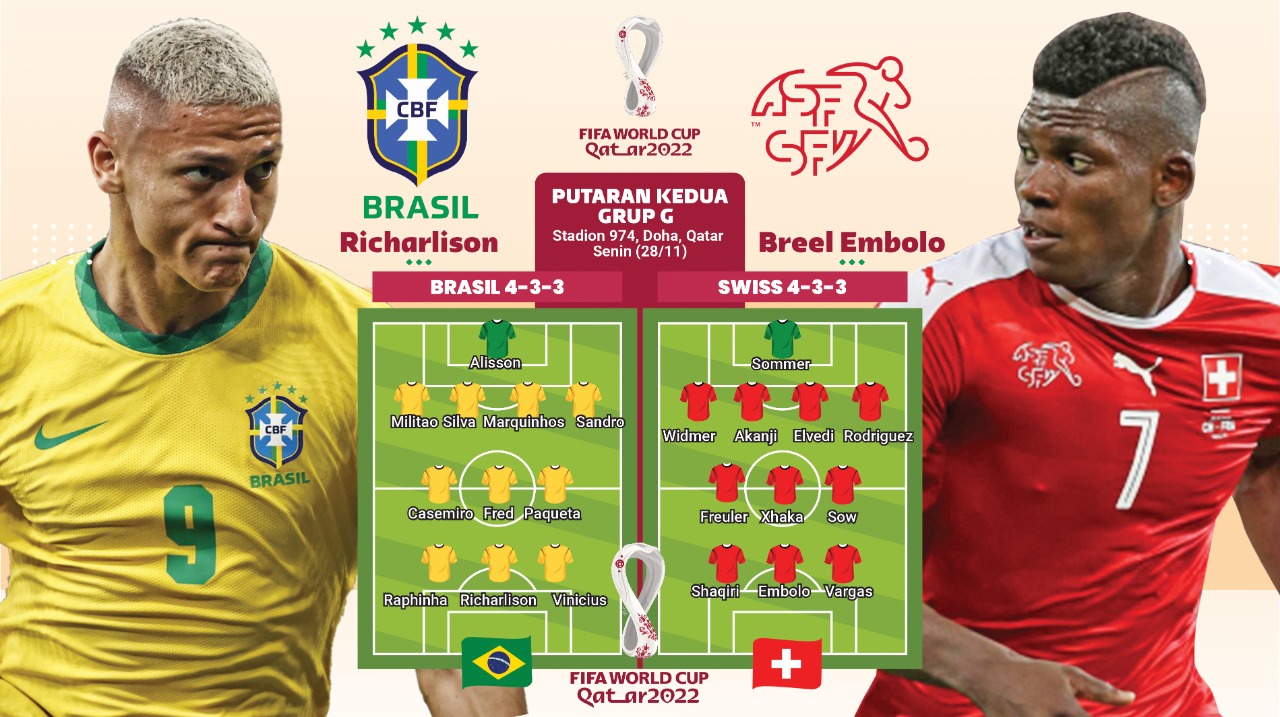 Duel Timnas Brasil vs Timnas Swiss akan berlangsung di Stadion 974, Besok dini hari, Selasa 26 November 2022 Pukul 00.00 WITA.