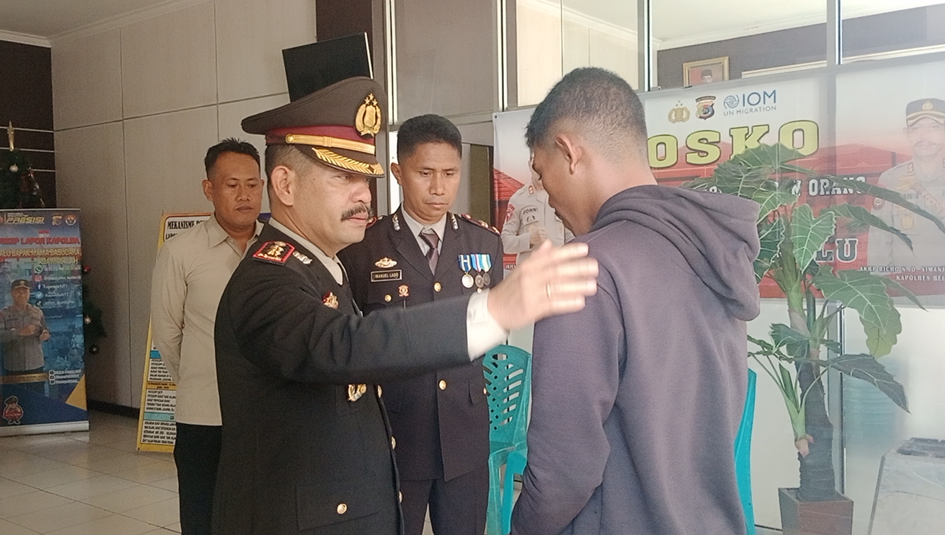 Kapolres Belu, menepuk bahu pelaku sembari berdialog memastikan dirinya aman untuk jalani proses lanjutan.