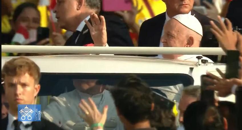 Dari balik mobil Maung bak terbuka ia menyapa umatnya. Di atas mobil putih buatan Pindad itu ia diamping Kardinal Suharyo. Ia duduk dan tangannya melambai ke seluruh arah umat. Ia tak berhenti tersenyumnya.