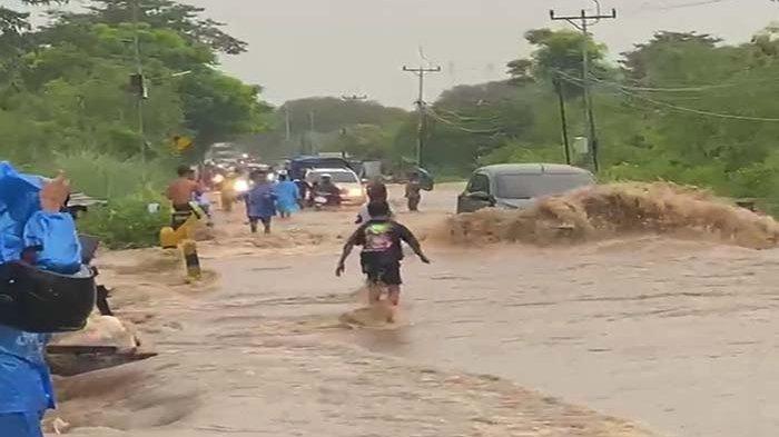 TRIBUNFLORES.COM, OELAMASI - Hujan deras membuat banjir meluap dan menggenangi jalan Timor Raya tepatnya di batas Desa Oebelo dan Desa Tanah Merah Kabupaten Kupang.