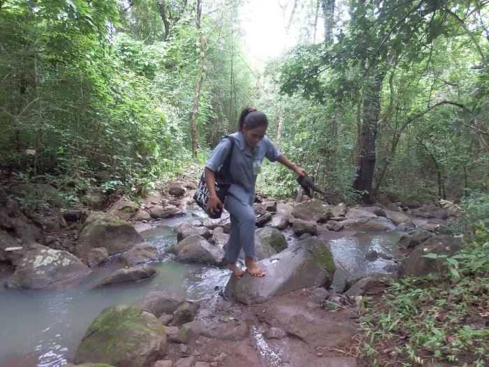 Perjalanan panjang dari rumah ke sekolah tidaklah mulus, ia harus melewati hutan, mendaki bebatuan dan kadang harus menyeberang kali apabila terjadi banjir.
