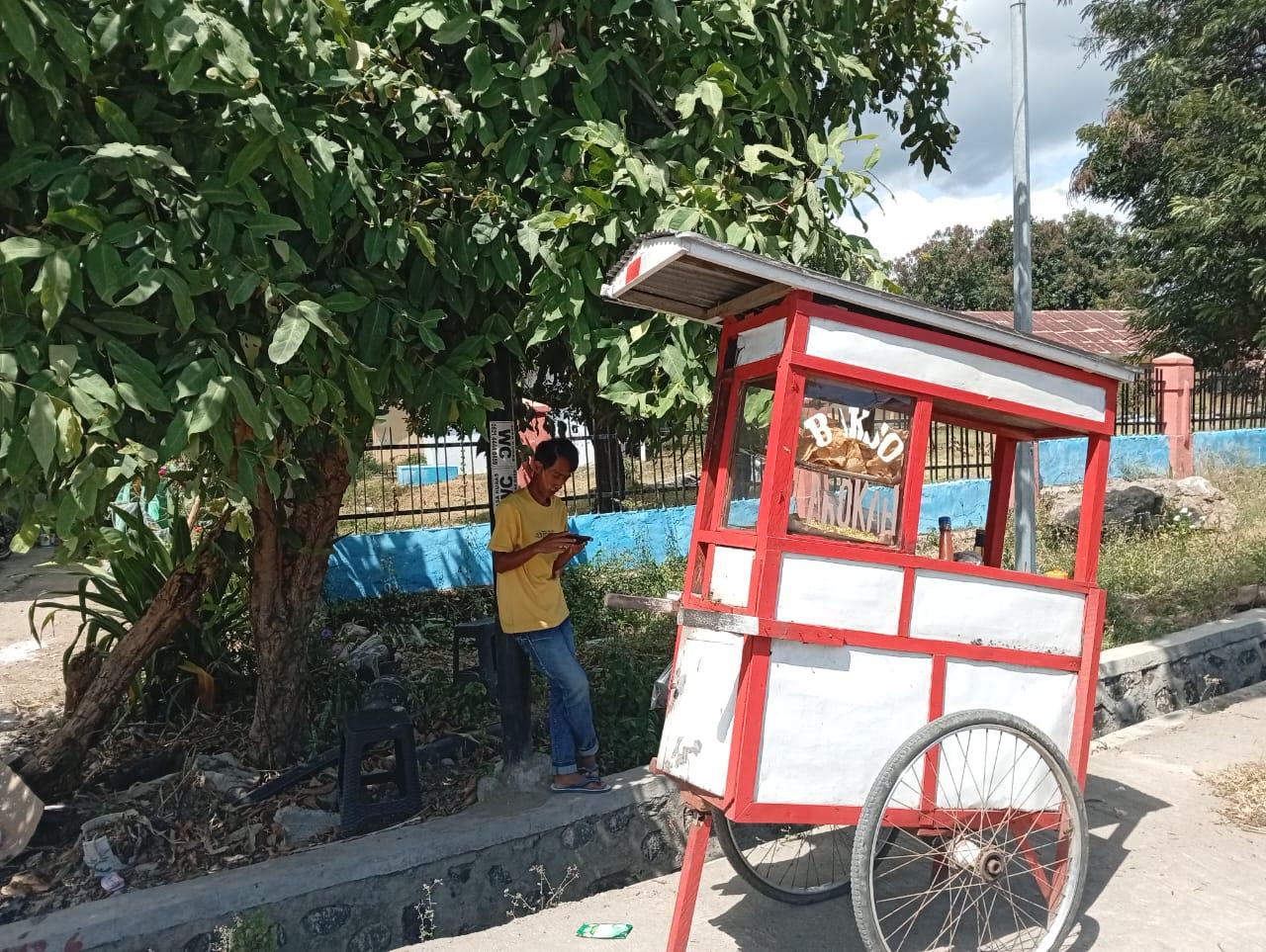 Dia setiap hari mendorong gerobak dari Gang Gunung Mas, mengitari lorong-lorong kecil di kota Labuan Bajo mulai pukul 10.00 Wita hingga pukul 21.00 Wita.