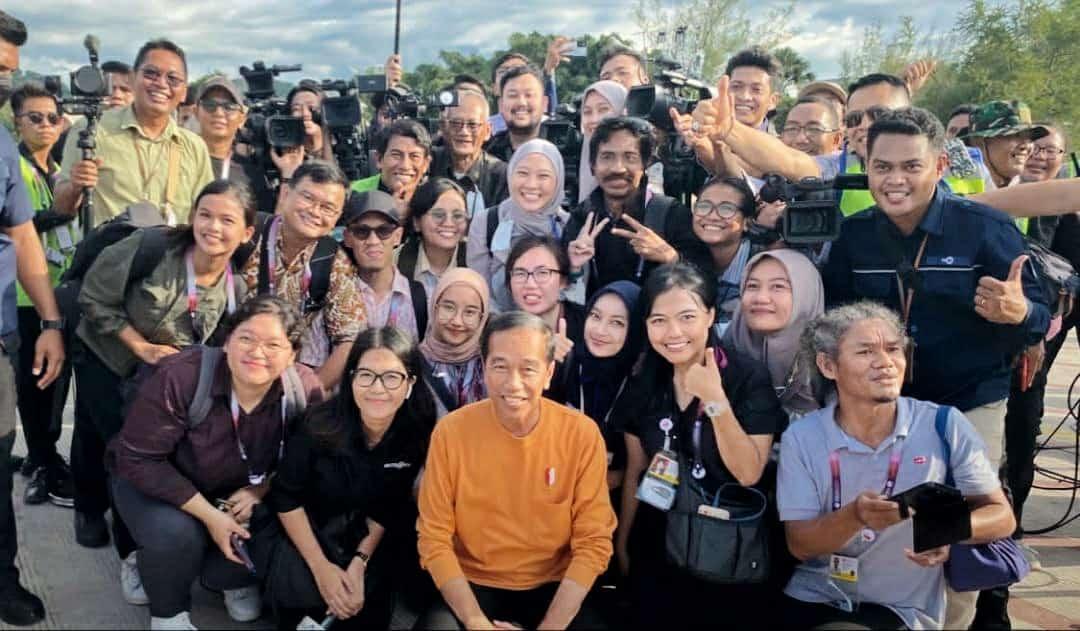 Presiden Jokowi menyempatkan diri untuk berfoto bersama awak media yang meliput kedatangannya di Bandara Komodo Labuan Bajo, Manggarai Barat